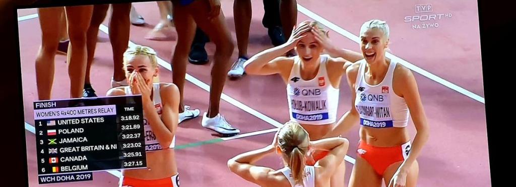 Polska reprezentacja kobiet w składzie: Iga Baumgart-Witan, Patrycja Wyciszkiewicz, Małgorzata Hołub-Kowalik oraz Justyna Święty-Ersetic, wywalczyła drugie miejsce w sztafecie na lekkoatletycznych mistrzostwach świata w Doha. Polki ustanowiły także nowy rekord Polski.