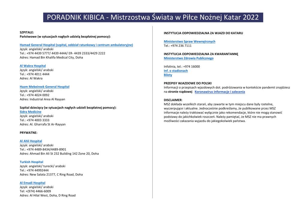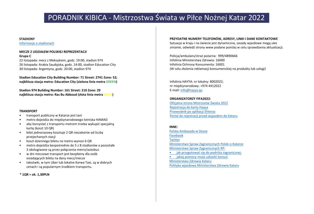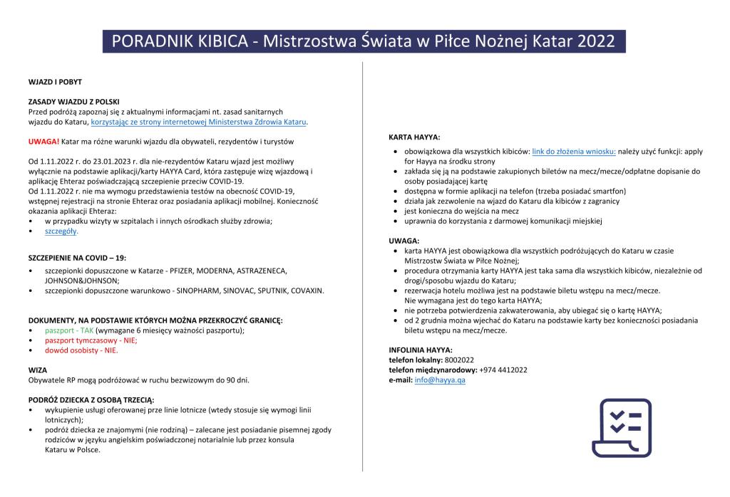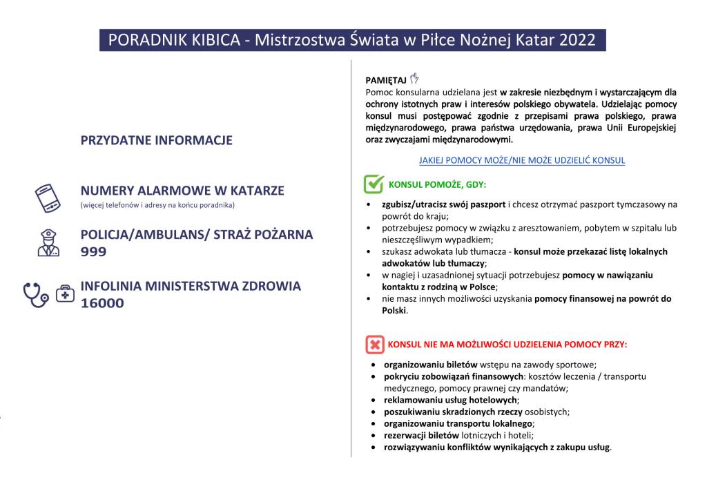 W związku z rozpoczynającymi się 20 listopada w Katarze Mistrzostwami Świata w Piłce Nożnej, z myślą o osobach uczestniczących w wydarzeniu, Ministerstwo Spraw Zagranicznych przygotowało specjalny Poradnik Kibica.