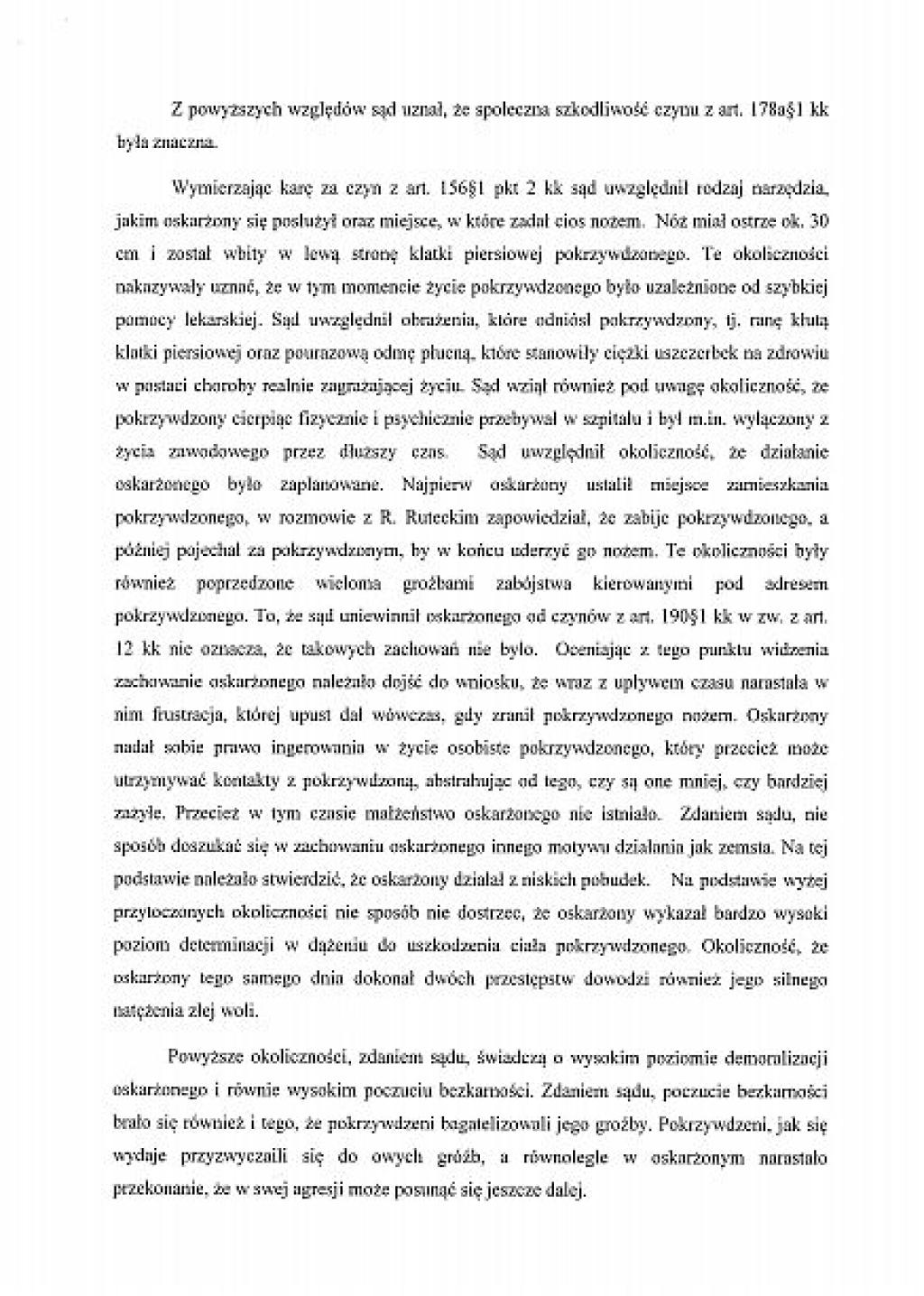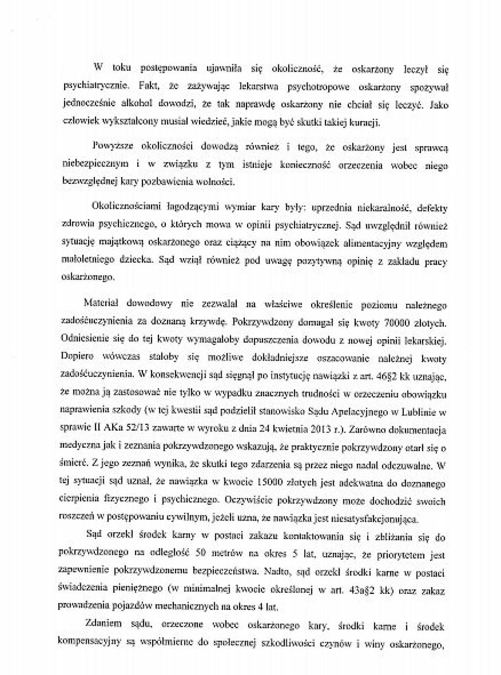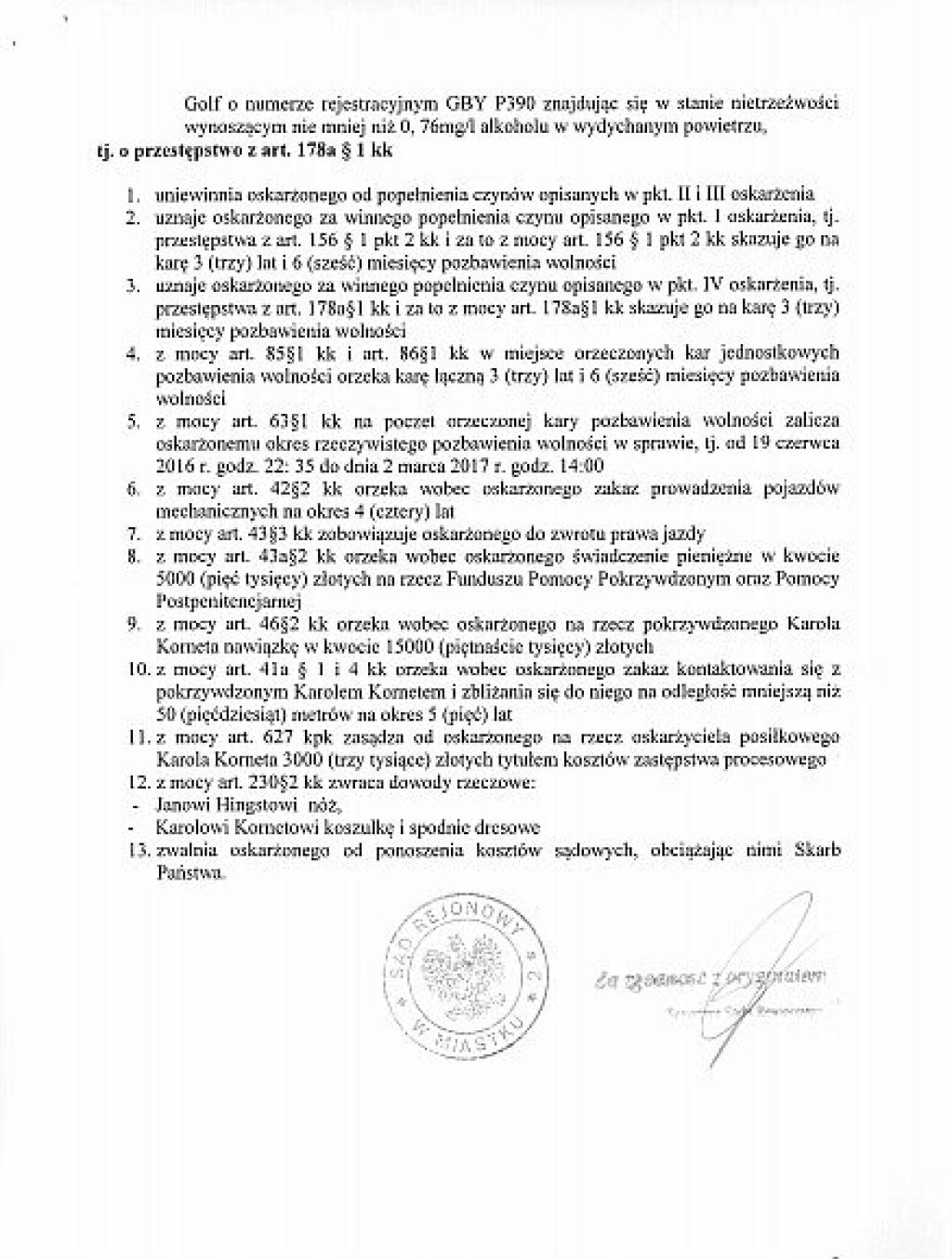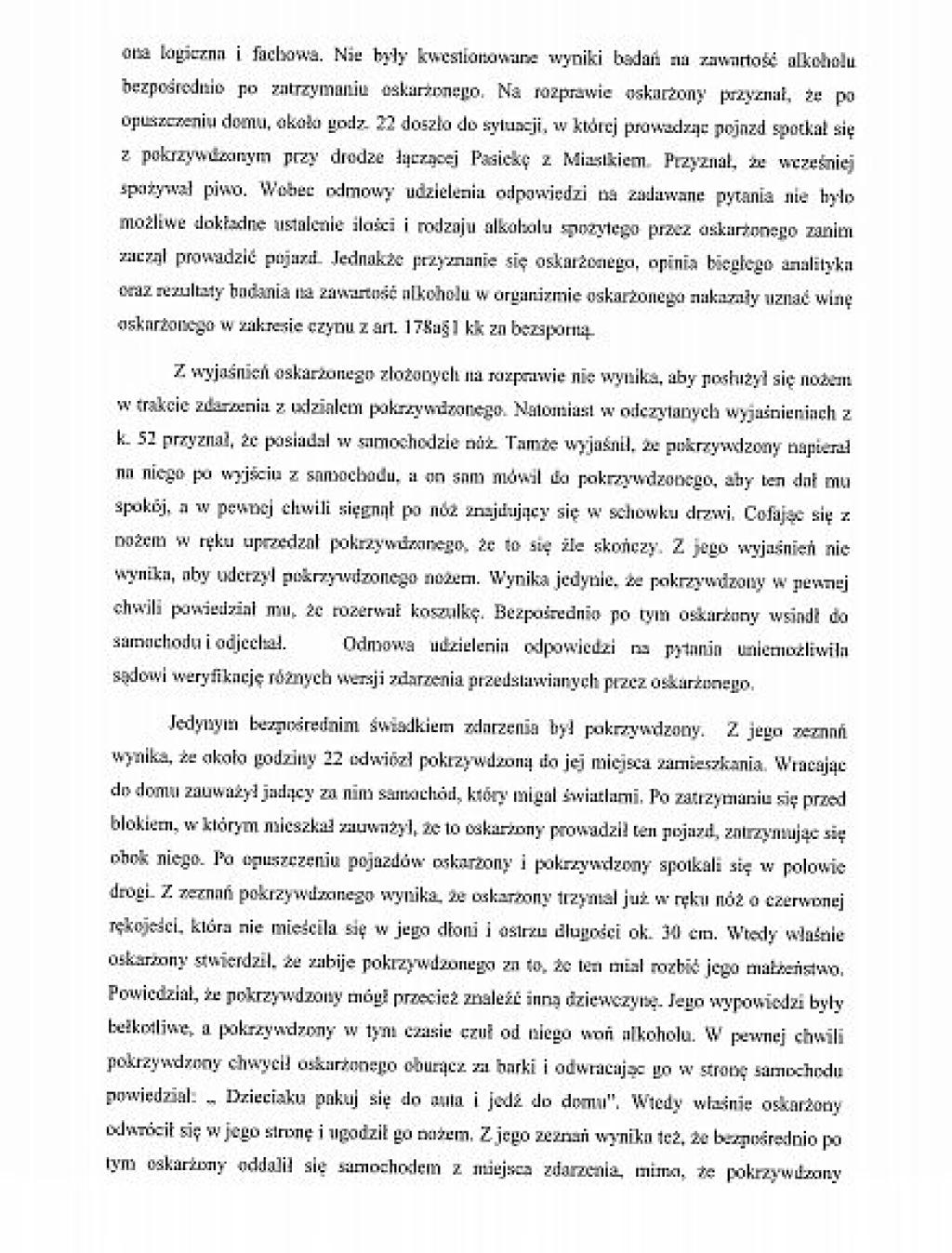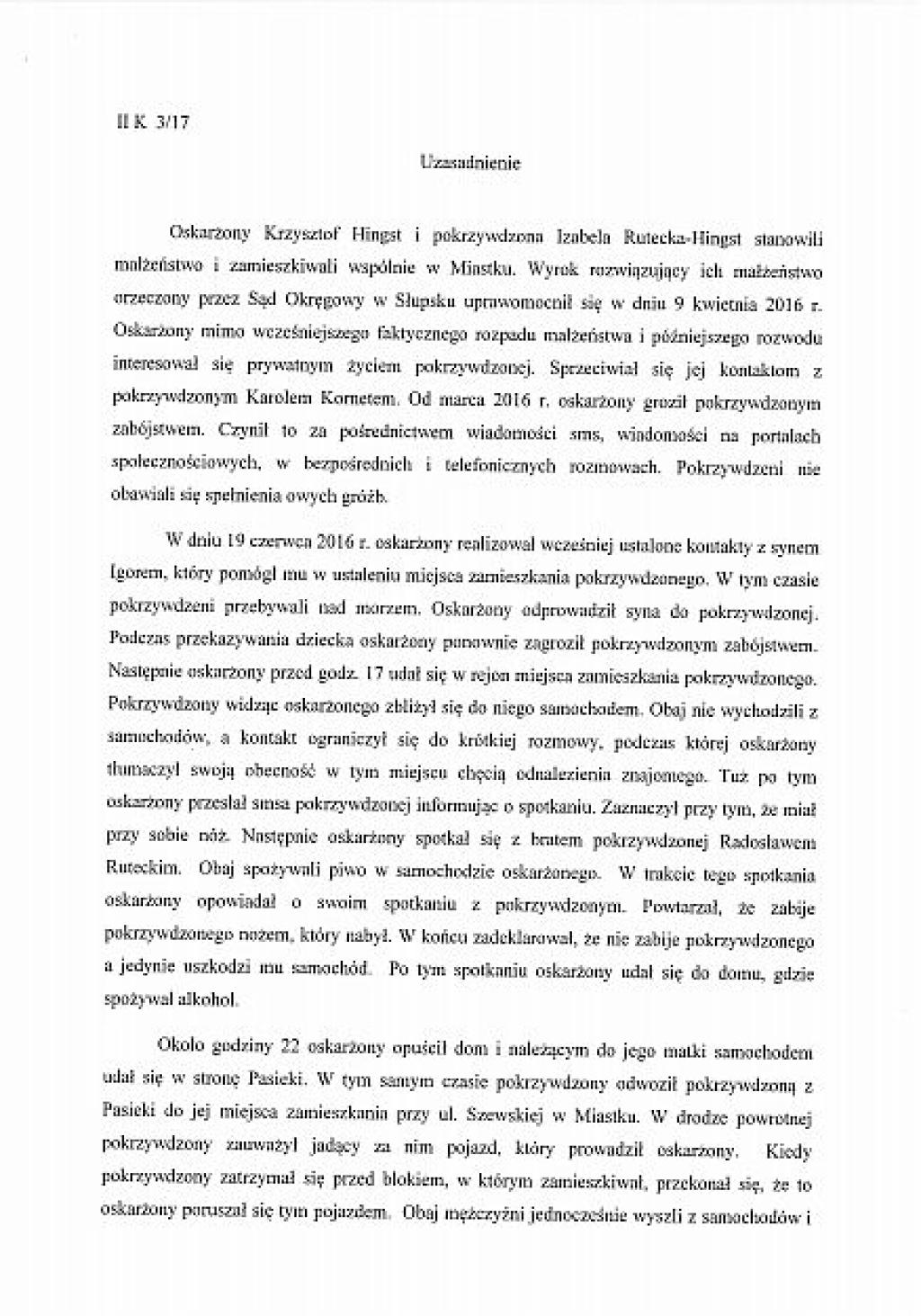 Prezentujemy, wraz z niniejszym artykułem, pełny tekst uzasadnienia wyroku, jaki zapadł przed Sądem Rejonowym w Miastku. Sędzia Bogdan Kostyk uznał za wiarygodnego Karola K., który nie pamiętał przed sądem, pod jakimi zeznaniami podpisał się na policji. A były to zupełnie inne zeznania niż skazanego Krzysztofa Hingsta, którego biegły psychiatra uznał za wiarygodnego.