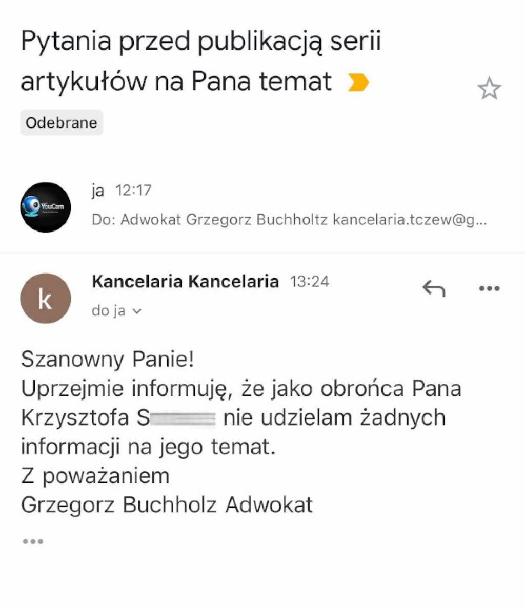 Adwokat Grzegorz Buchholz udzielił jednak odpowiedzi pisząc, że jako przedstawiciel swojego klienta nie udzieli nam żadnych informacji. Jego odpowiedź również zamieszczamy wraz z niniejszym tekstem.