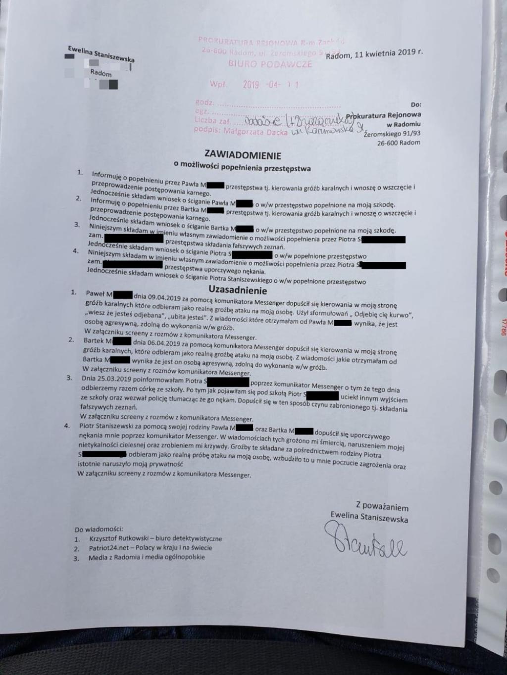 Zaszczuta matka sprawę zgłosiła też do Prokuratury Rejonowej w Radomiu celem ścigania tej grupy przestępczej. Choć w głębi już nie wierzy w skuteczność działania Organów Państwa Polskiego w sprawie koszmaru jej 7-letniej córeczki,