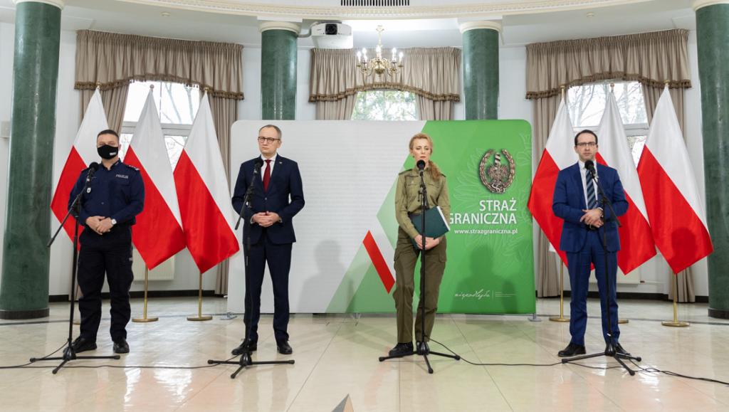 – Wypracowaliśmy zasady, które pozwolą zagwarantować bezpieczeństwo dziennikarzom relacjonującym wydarzenia z granicy, a także pomogą utrzymać bezpieczeństwo pełnienia służby przez formacje podległe MSWiA i Wojsko Polskie – powiedział wiceminister Błażej Poboży podczas konferencji prasowej w siedzibie Komendy Głównej Straży Granicznej.